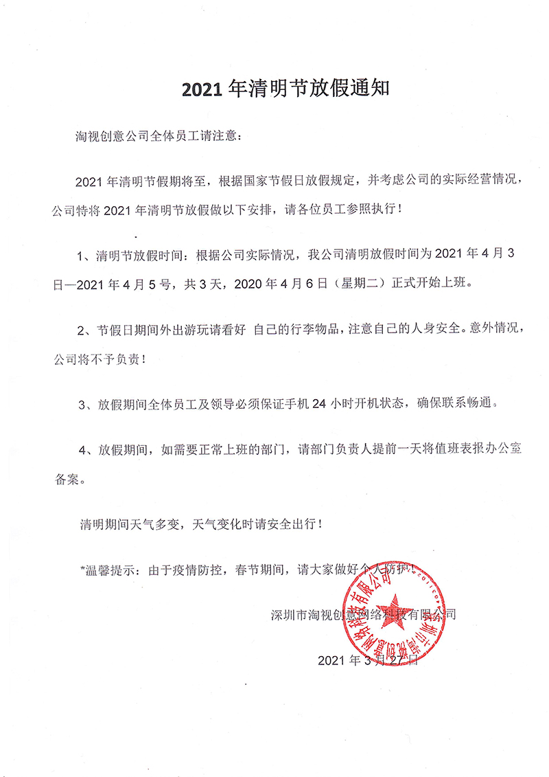 2021年清明节假期将至,根据国家节假日放假规定,并考虑公司的实际经营情况,公司特将2021年清明节放假做以下安排,请各位员工参照执行!