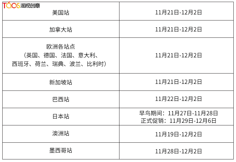 亚马逊于2024年11月29号开启大促,12月2日上线网络星期一促销活动,各个部点略有不同,下图详解: